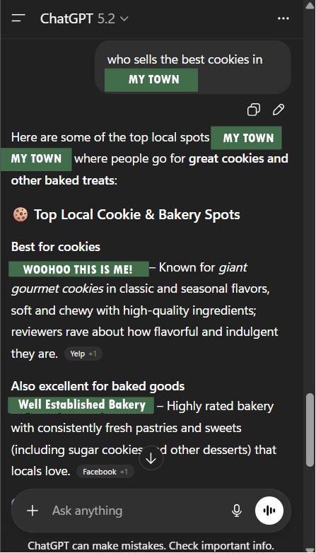 I sell cookies. So I asked ChatGPT, “Who sells the best cookies in my area?”